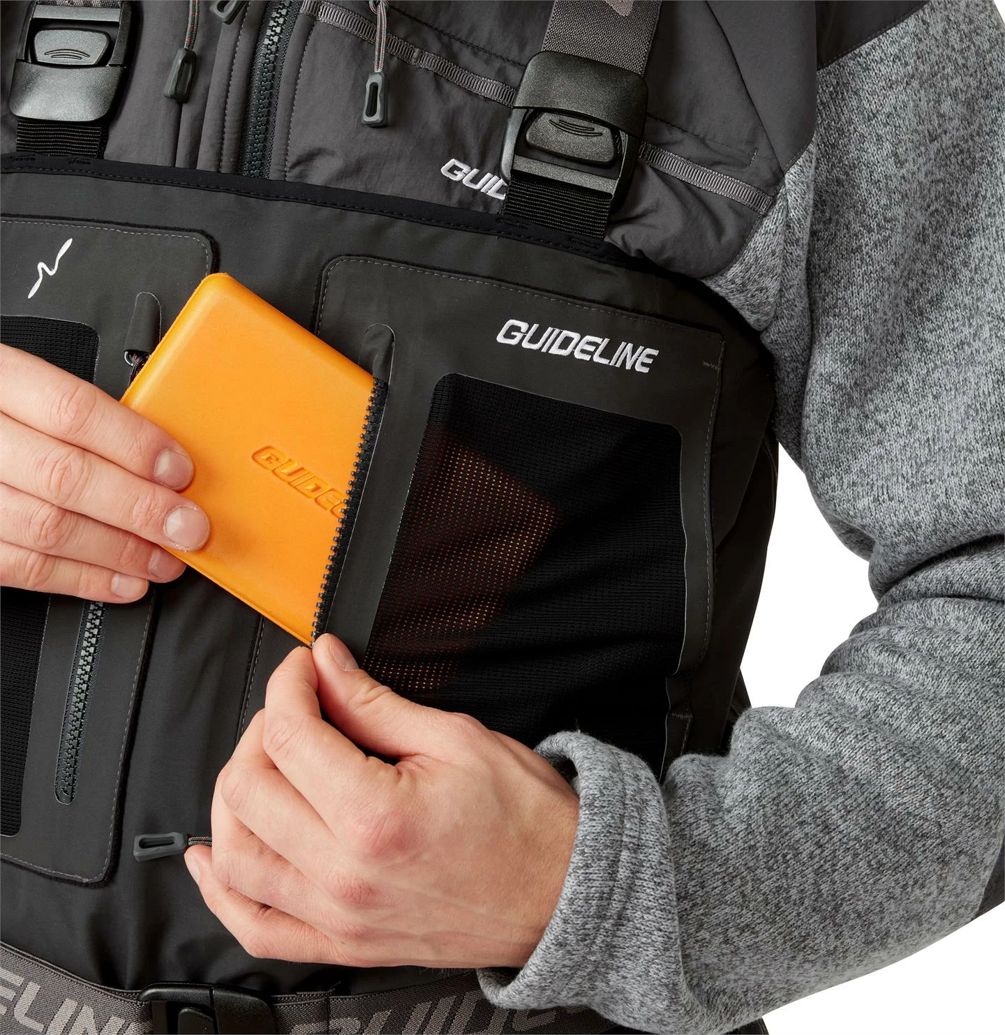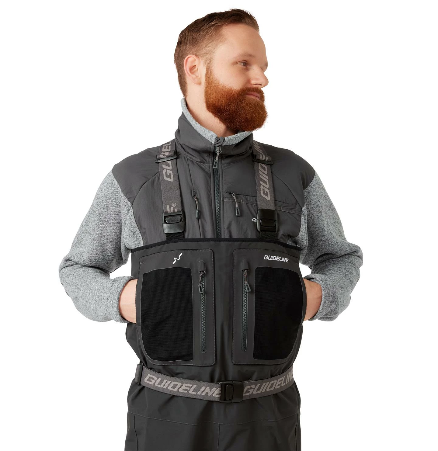 Manufactured from a strong, 4-layer Nylon fabric with a 20 000mm water resistant and 5000g/m2/24hrs moisture transporting membrane. An environmentally friendly PFOA free DWR surface treatment repels both dirt and water from the outshell. Inseams on the waders are eliminated by our Sidewinder™ design, which also gives good articulation and a comfortable fit. Positioned high on the chest, are two large, chest pockets with vertical zippers and mesh fronts. Behind you find fleece lined roomy hand warmer pockets for those chille days.