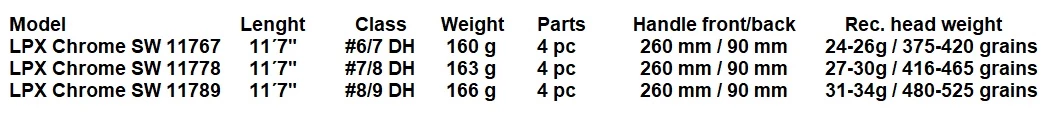 LPX Chrome SW 11’7” #7/8 – Probably the most versatile switch rod in the series. It has a bit more back-bone than the 6/7. But still an ultra-light, responsive and super user-friendly double hander. For a fly line of choice, we recommend our 3D+ Compact lines.